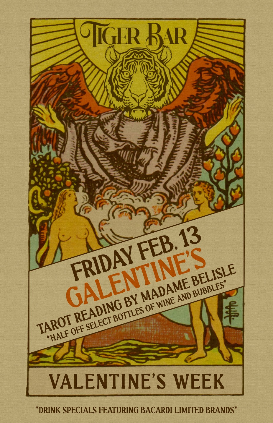 Join us for Galentines at Tiger Bar! Sparkling wine and chocolate covered strawberries on special, and tarot readings by Madame Belisle